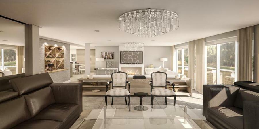 Apartamento com 313m² privativos, 3 suítes, ampla sacada, área social com 3 ambientes, lareira, jantar com espaço gourmet com churrasqueira, lavabo, lavanderia separada com banho de serviço, vidros duplos, sistema de calefação e split instalados, 2 vagas de garagem e 2 estacionamentos, elevador panorâmico.